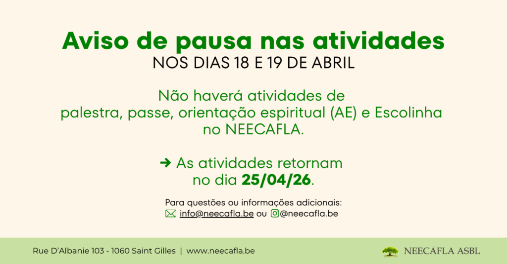 Não haverá atividades de causerie, passe, orientação espiritual (AE) e Escolinha no NEECAFLA nos dias 18 e 19 de abril.
